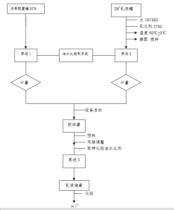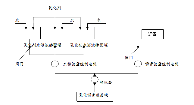乳化瀝青生產(chǎn)流程大致分成瀝青配制、乳化劑水溶液配制、瀝青乳化和乳化瀝青儲存四個主要程序。