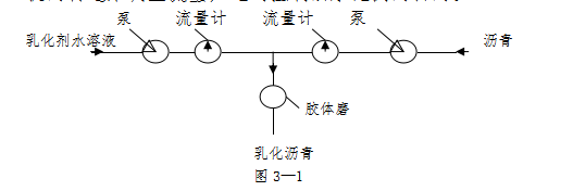瀝青乳化是生產(chǎn)合格乳化瀝青的關鍵步驟。宿遷市公路工程建設處的乳化設備采用是閉式生產(chǎn)的方式,其流程圖見圖3—1。