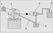 圖2所示為從乳化液的液面上去除浮油的一種裝置,它是利用浸在液體中旋轉著的甩油盤2來實現的。浮油黏附在盤上,利用刮板把油刮下來并沿著斜槽6流聚到油罐5中,然后用活塞泵3再將油從罐5中抽出并輸送到容器4中,甩油盤的旋轉是通過傳動機構1來實現的。